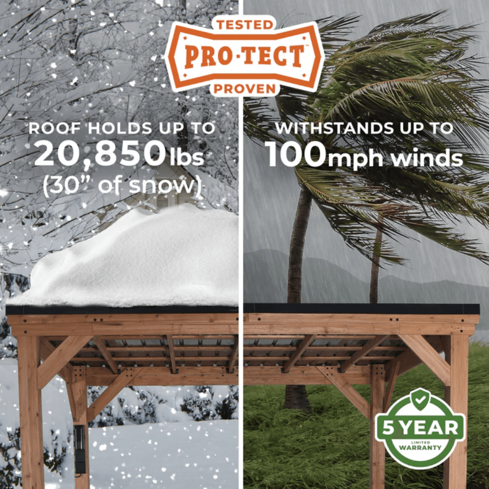 PRO-TECT™ Tested & Proven structure features a heavy-duty steel roof, 100% cedar wood posts, and reinforced powder-coated steel brackets to ensure superior strength and longevity.