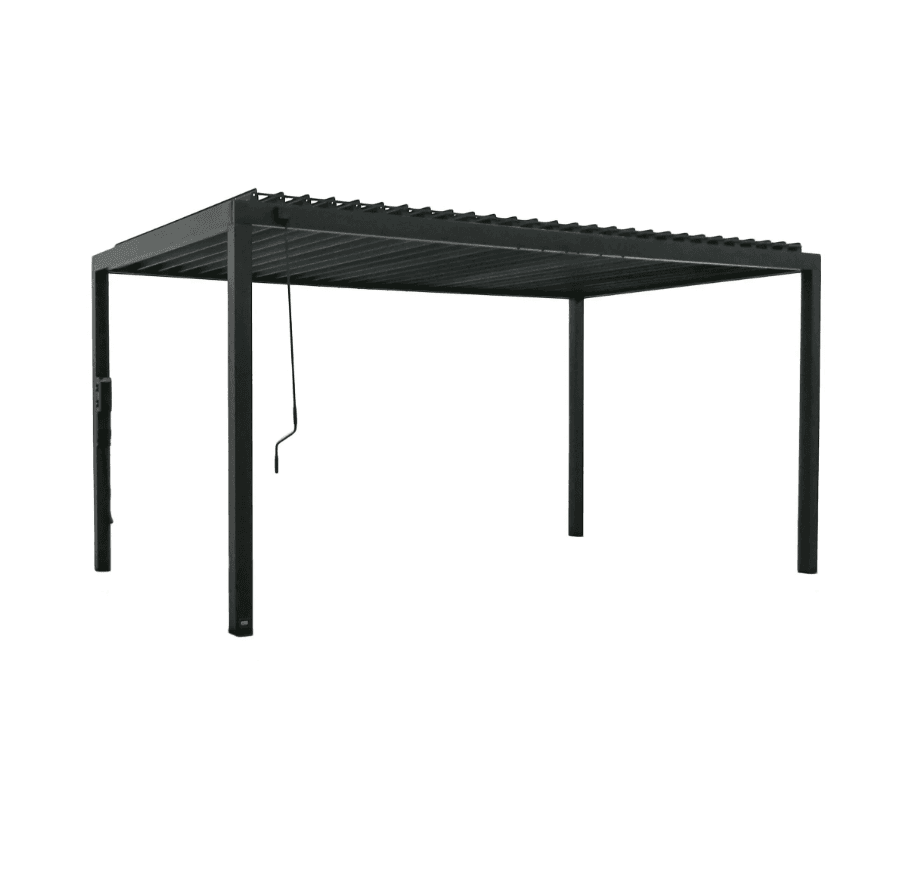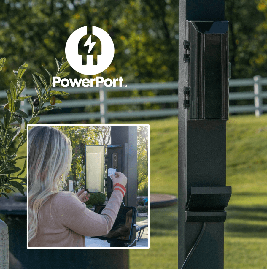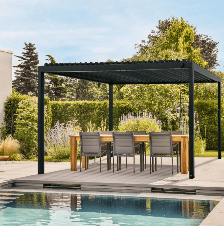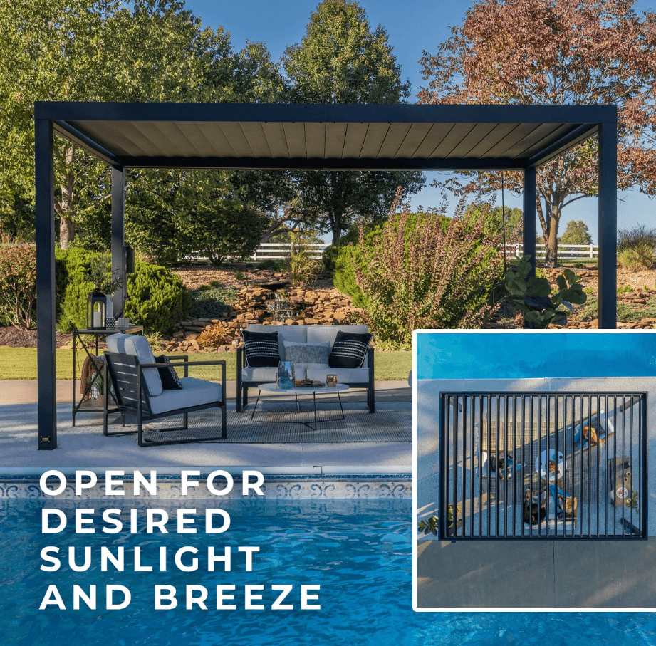 The Sarasota Louvered Pergola elevates your outdoor living space with beautiful modern style. Built with heavy-duty, galvanized steel, its adjustable louvers can be easily opened to allow filtered sunlight through or closed completely to enjoy shade and weather protection. Complete with powder-coated steel posts and anchoring plates, the Sarasota is Pro-Tect™ tested and proven to withstand up to 3,100 pounds of roof weight and 100 mph wind speeds*, ensuring a lasting upgrade to your backyard. The integrated drainage system directs rainwater to downspouts in the steel posts and is equipped with gutter guards to prevent debris blockages. The 100% galvanized powder-coated steel is not only completely maintenance free but is also rust and corrosion-resistant for contemporary charm that’s built to last. Boasting sleek lines and an elegant black finish, this contemporary patio pergola accommodates seating, tables, and decor for a stylish, comfortable outdoor living space. With our patented PowerPort™, featuring three electrical outlets and USB ports, it’s easy to connect lighting, music, devices, and more. This outdoor pergola kit is ready to assemble and offers guided instructions through the BILT® app for easier installation