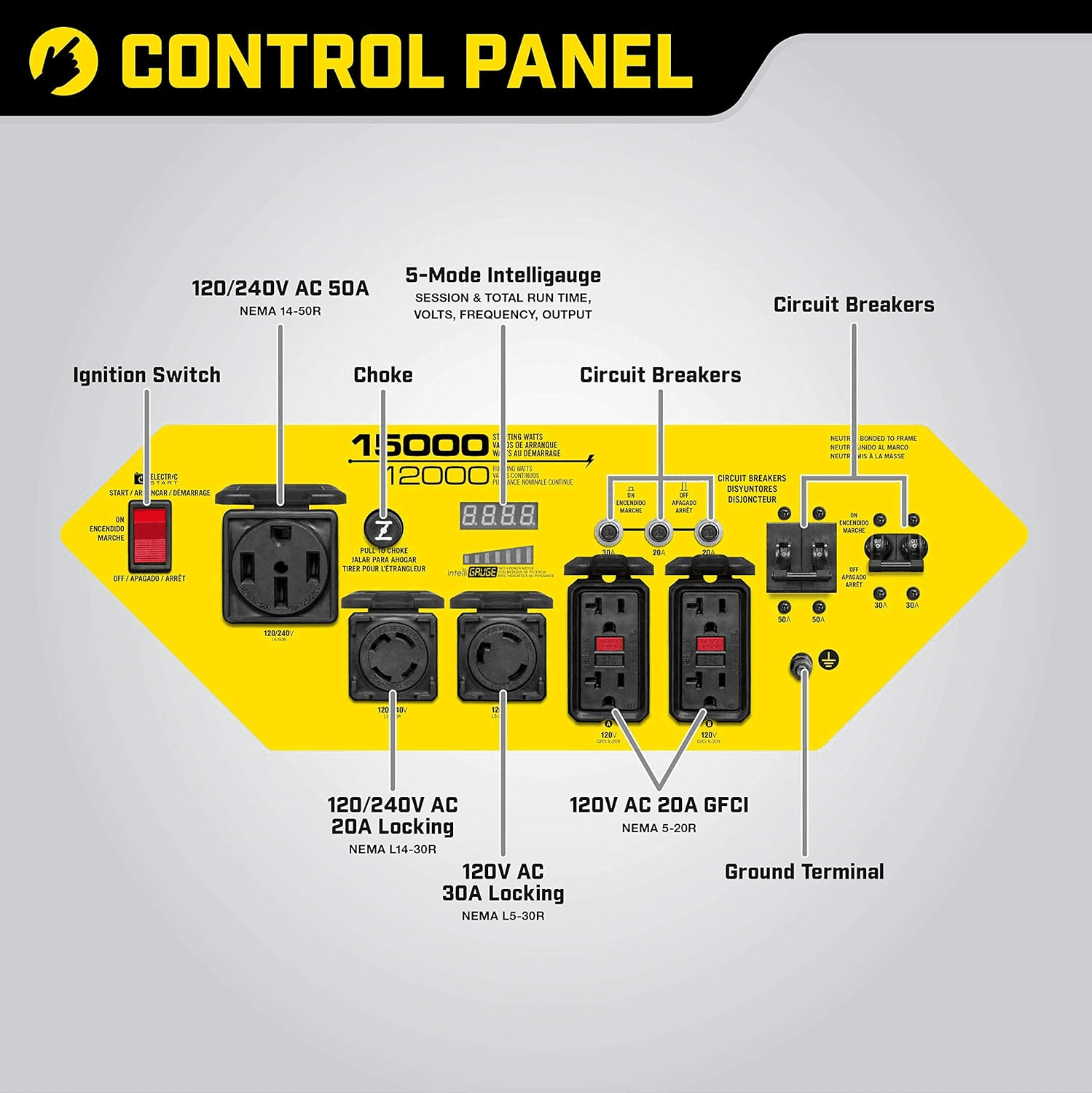 Multiple outlets (120V, 240V, GFCI) with Volt Guard™ for overload protection.
