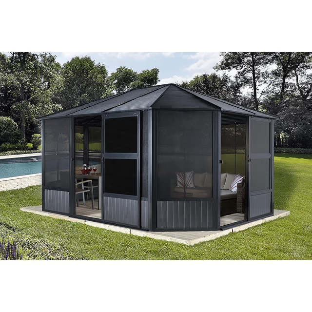 Its sleek dark grey frame and classic design add value to your property while offering year-round use and comfort. Whether enjoying summer breezes or sheltering from the rain, this solarium creates a luxurious outdoor living area you’ll love.