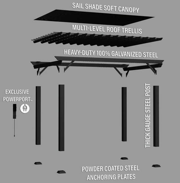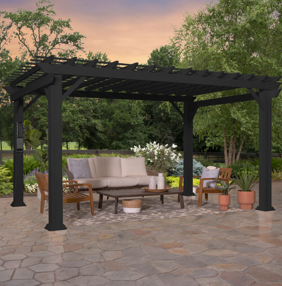 Traditional and timeless, the Stratford Steel Pergola by Backyard Discovery brings effortless charm to your outdoor living area. This stunning patio pergola combines enduring craftsmanship with modern sophistication, featuring a stylish black finish that creates a bold, striking aesthetic. Engineered with powder-coated galvanized steel, it delivers maintenance-free durability while providing superior protection against rust, chipping, corrosion, and UV damage. The elegant design provides plenty of shade with the integrated pergola canopy. This soft shade sail filters sunlight while offering protection from the elements, creating the ideal balance of shelter and ambiance. Pro-Tect™ tested and proven to withstand winds up to 100 mph*, this outdoor metal pergola stands strong through adverse weather conditions. Its generous size provides plenty of room for furniture, fire pits, and outdoor décor to create the perfect space for gatherings or simply relaxing. The patented PowerPort™ features three electrical outlets and three USB ports, making it easy to power your outdoor entertainment needs. This ready-to-assemble backyard pergola kit offers step-by-step guidance with the BILT® app, for easier installation.