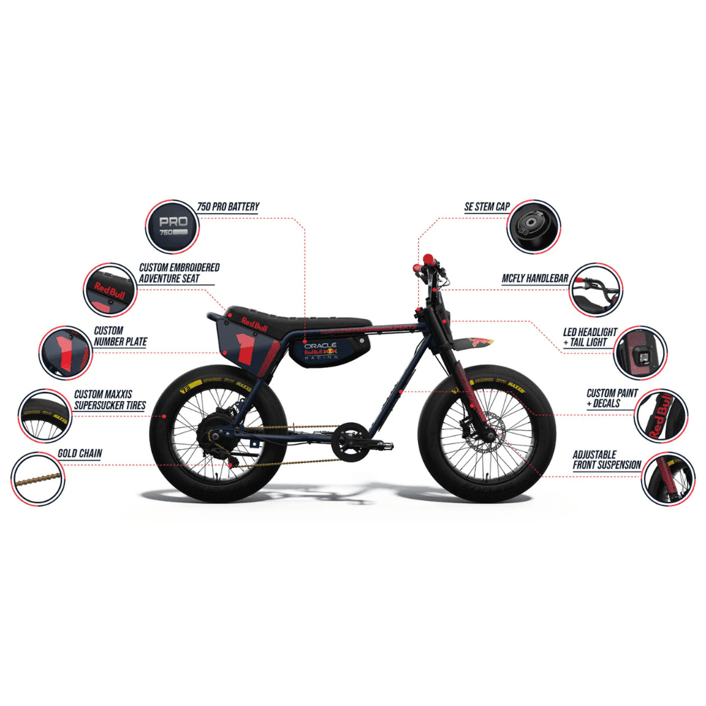 Introducing the custom Oracle Red Bull Racing x SUPER73-Z Adventure Series—a fusion of high-octane performance and retro-inspired design that transforms everyday riding into an adrenaline-fueled experience. This exceptional electric bike is tailored for riders who crave both style and speed, merging Oracle Red Bull Racing’s racing pedigree with SUPER73’s innovative engineering to deliver a ride that stands apart from the crowd.