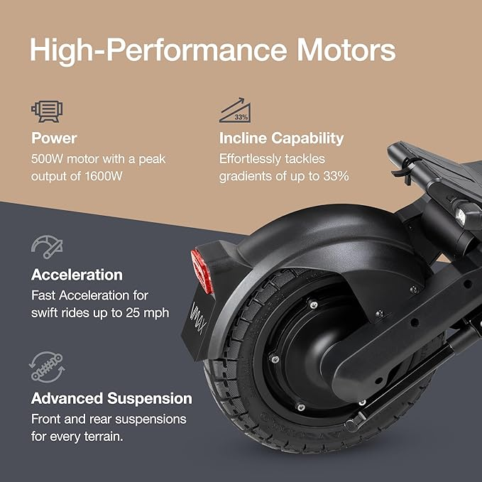 - Swiss Engineered and Flagship Quality – Experience the evolution in adult electric scooter with the Swiss-engineered VMAX VX4 LT. Featuring a powerful 500-watt motor with a peak power of 1,600 watts, enjoy exceptional acceleration and reach speeds of up to 25 mph.