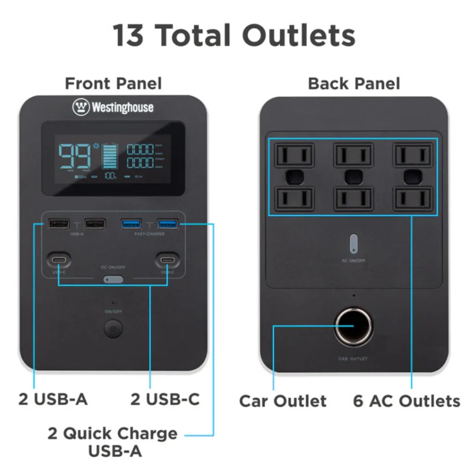 Provides up to 1200 peak watts (approximately 1000 running watts) of AC power, ensuring you can safely run essential appliances, charge electronics, or power small tools when you need it most.